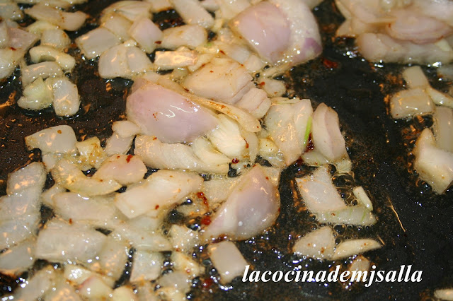 Segundo. SOFRÍE LOS AJOS Y CEBOLLA. Picamos los ajos y la cebolla y los freímos a fuego moderado en el aceite donde hemos frito el conejo.